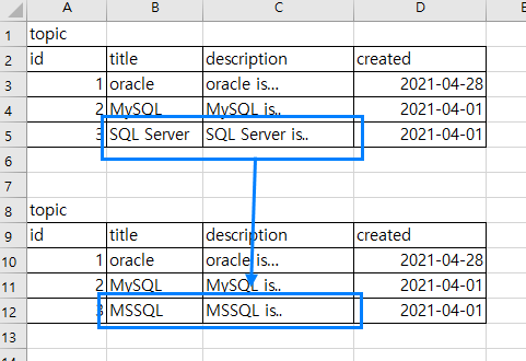 -> topic의 id가 3인 행의 title을 MSSQL로 description을 MSSQL is... 로 수정한다.