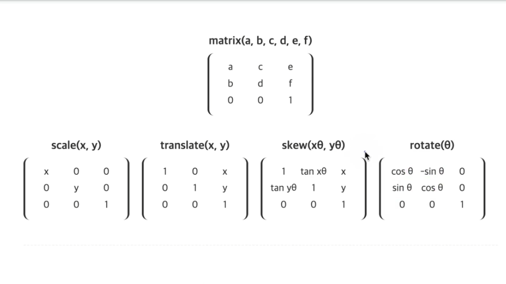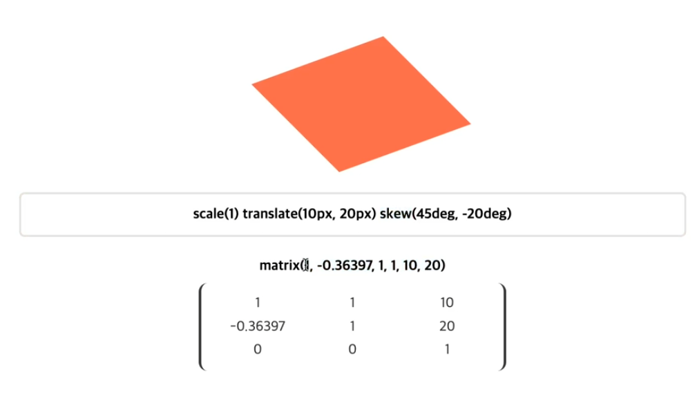 ※ 요소에 일반 변환(Transforms) 함수(2D, 3D)를 사용하더라도 브라우저에 의해 matrix 함수로 계산되어 적용됨.