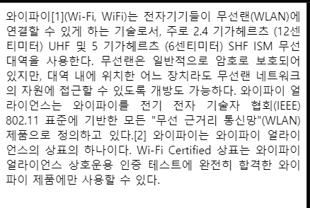 <div> 와이파이[1](Wi-Fi, WiFi)는 전자기기들이 무선랜(WLAN)에 연결할 수 있게 하는 기술로서, 주로 2.4 기가헤르츠 (12센티미터) UHF 및 5 기가헤르츠 (6센티미터) SHF ISM 무선 대역을 사용한다. 무선랜은 일반적으로 암호로 보호되어 있지만, 대역 내에 위치한 어느 장치라도 무선랜 네트워크의 자원에 접근할 수 있도록 개방도 가능하다.