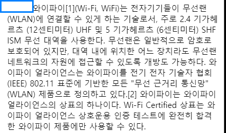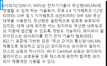 <div> 와이파이[1](Wi-Fi, WiFi)는 전자기기들이 무선랜(WLAN)에 연결할 수 있게 하는 기술로서, 주로 2.4 기가헤르츠 (12센티미터) UHF 및 5 기가헤르츠 (6센티미터) SHF ISM 무선 대역을 사용한다. 무선랜은 일반적으로 암호로 보호되어 있지만, 대역 내에 위치한 어느 장치라도 무선랜 네트워크의 자원에 접근할 수 있도록 개방도 가능하다.