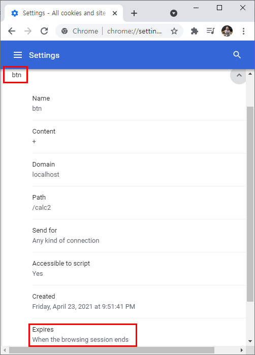 btnCookie는 Expires가 When the browsing session ends로 브라우저가 종료되면 만료된다.