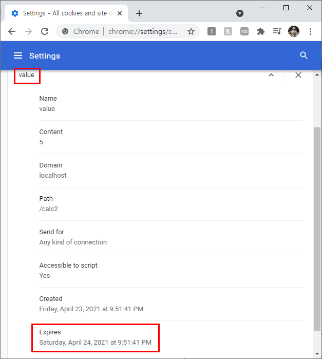 valueCookie의 Expires가 24시간으로 설정된 것을 확인할 수 있다.