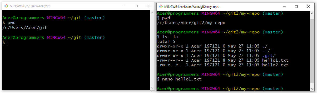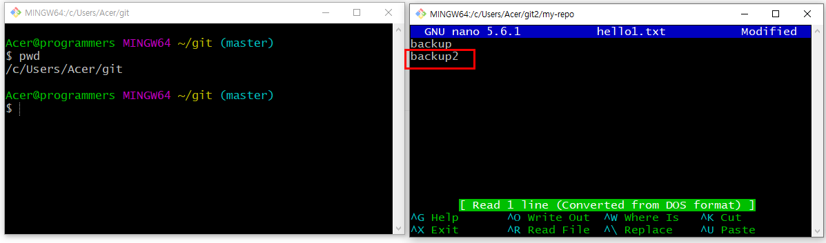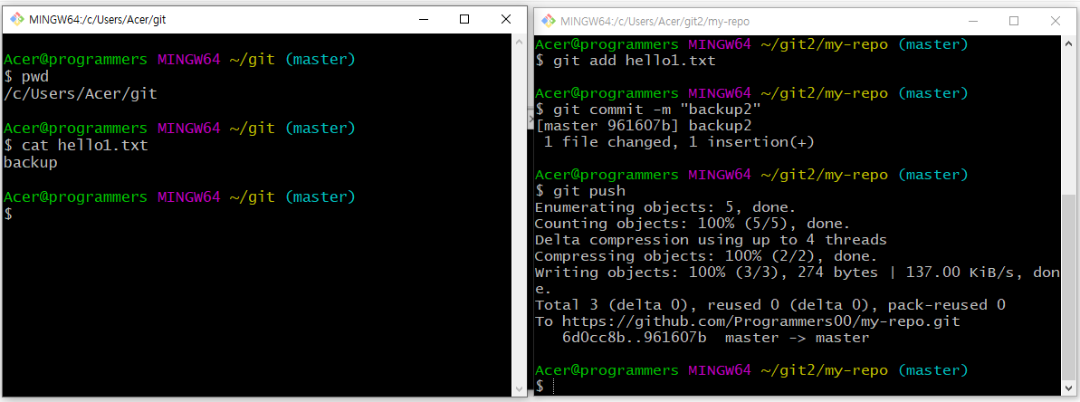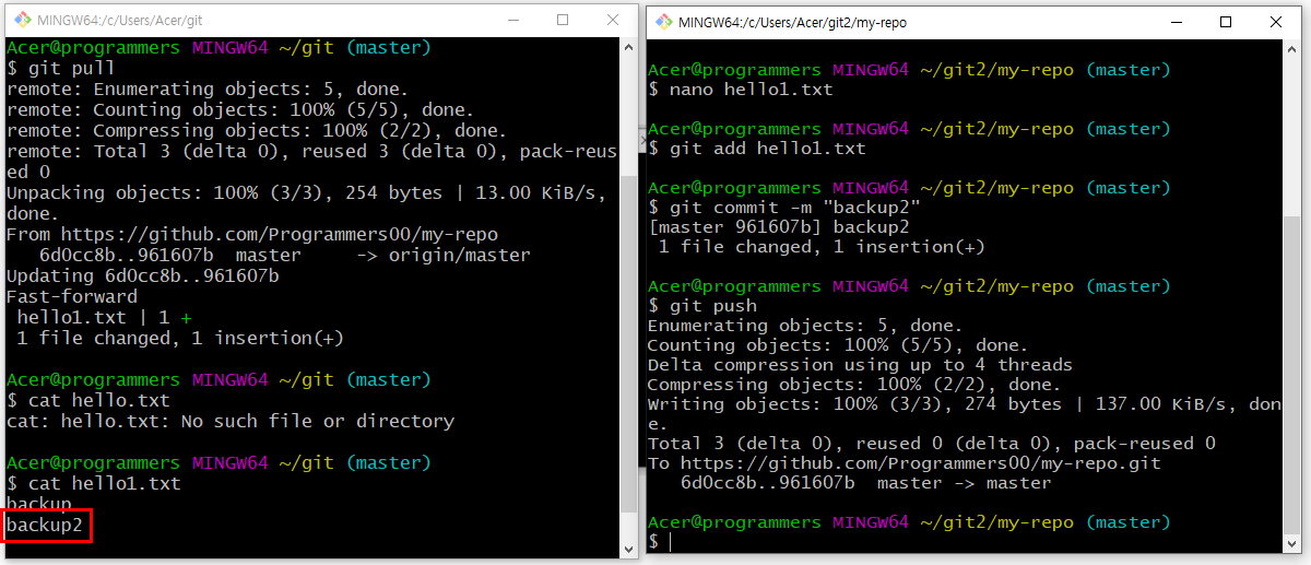왼쪽 컴퓨터에서 pull을 통해서 동기화시켜주면 hello1.txt의 내용에 backup 2가 추가되는 것을 확인할 수 있다.