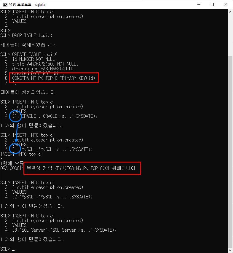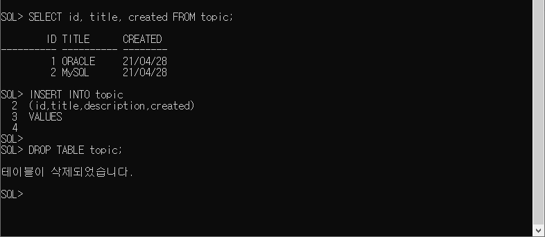 -> topic TABLE 삭제. commit; 명령어 필요 없음.