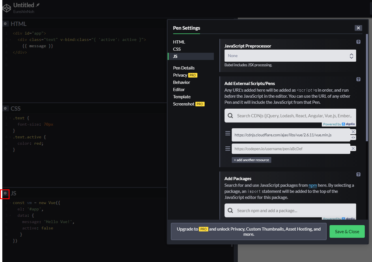 빨간색 설정버튼을 눌러서 Add External Scripts/Pens의 검색창에 Vue라고 치면 Vue버전들이 나온다. 2.xxx 버전을 사용하는 것을 권장한다.