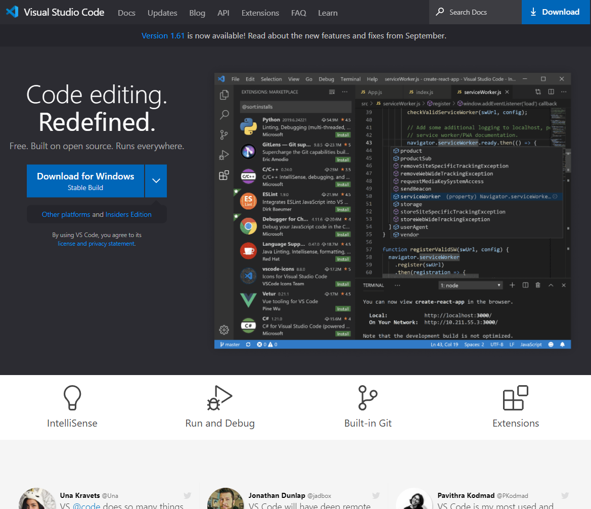 Visual Studio Code is a code editor redefined and optimized for building and debugging modern web and cloud applications. Visual Studio Code is free and available on your favorite platform - Linux, macOS, and Windows.